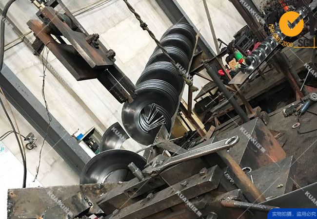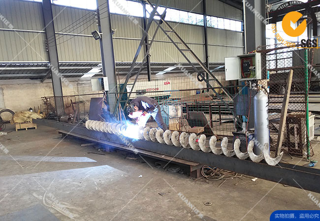 与水平螺旋输送机在结构上大致相同,也是由驱动装置(电动机、减速器、联轴节)、螺旋、轴承、料槽、进料口、出料口等几部分组成,但其工作原理不一样:在输送过程中,物料随着螺旋作高速旋转,由于离心力的作用,物料在料槽内形成若干同心圆层,物料的最外层紧贴槽壁。当螺旋转速不高时,物料与螺旋表面的摩擦力大于物料所受到的离心力,物料与螺旋一起作旋转的运动,保持相对静态;当螺旋转速较高时,物料所受到的离心力大于物料与螺旋表面的摩擦力.物料向螺旋的外缘移动,对料槽壁产生压力并同时产生摩擦力.只有当这个摩擦力大于物料与螺旋表面之间的摩擦力以及物料重力的分力之和时,物料将与螺旋表面之间发生滑动并沿反方向的螺旋形轨迹上升,即物料被垂直部分的螺旋推送上升,从而达到垂直上升输送的目的;否则只是旋转而不能上升·将此时的转速称为临界转速,只有当输送机的转速大于临界转速时.物料才能实现向上输送,这是垂直输送机的主要特点。其优点是:结构简单:所占空间位置小;易于密闭输送。制造费用较低。其缺点是:输送量小,输送高度小。